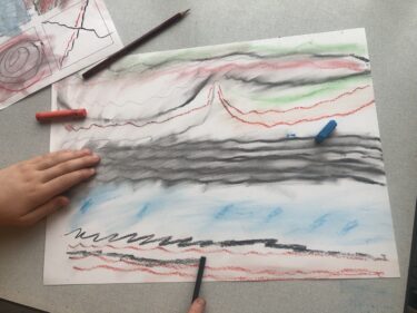 Lijnenkunstenaar Hundertwasser noemt zichzelf ook wel ‘Kapitein Regendag’. Omdat kleuren op een regendag zo goed naar voren komen. We gaan dit individueel uitproberen’. Vanuit grijze en zwarte lijnen verbeelden we een regendag maar we bewaren ook een plek voor een kleurrijk kunstwerk met lijnen. Dan gaan we zien of door die grijze dag de kleuren van het kunstwerk echt zo goed naar voren komen.
