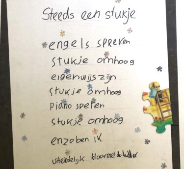 We gaan op zoek in een berg puzzelstukjes naar 1 stukje dat het beste bij jou past. Er zijn veel manieren om een keuze te maken; kleur, vorm, een afbeelding van iets. We bespreken in de groep waarom bepaalde stukjes werden gekozen en maken er daarna een woordspin bij. Vervolgens bespreken aan de hand van een paar voorbeelden wat poëzie eigenlijk is; ritme, klank, kleur… eigenlijk boetseren met woorden en zinnen. Vanuit de woordspin starten we met zinnen maken.