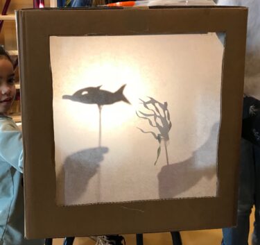 Deze schaduwtheatertjes zijn gemaakt van kartonnen dozen en bakpapier. Door openingen aan de zijkanten van de doos kunnen leerlingen met hun handen naar binnen om zo een schaduwverhaal spelen met zelfbedachte figuren. Beeldende kunst heeft dus ook een rol in dit project.