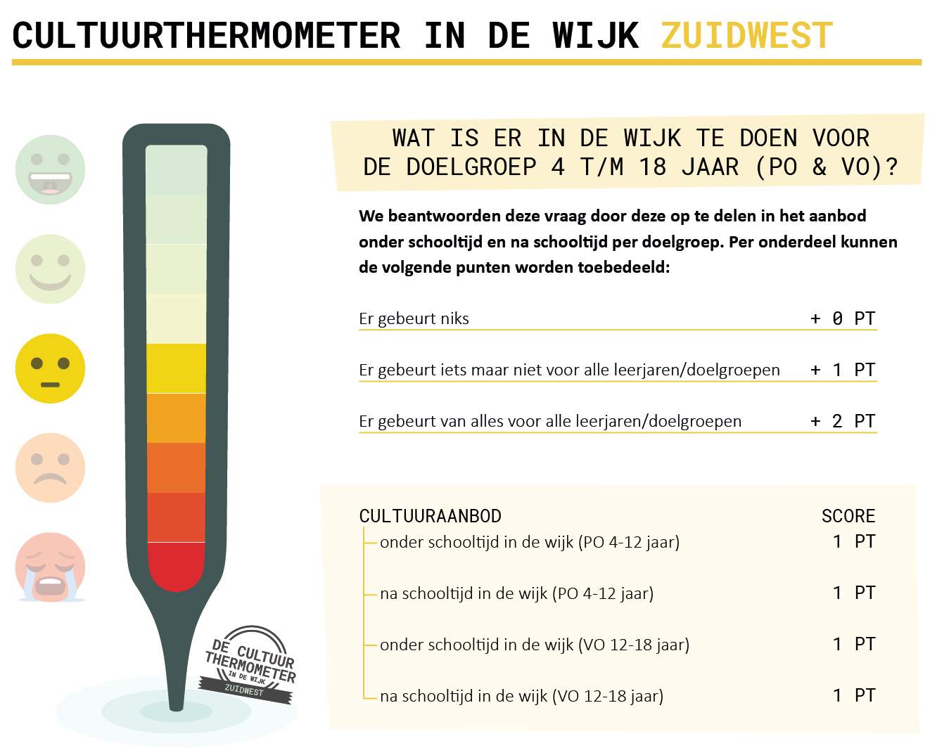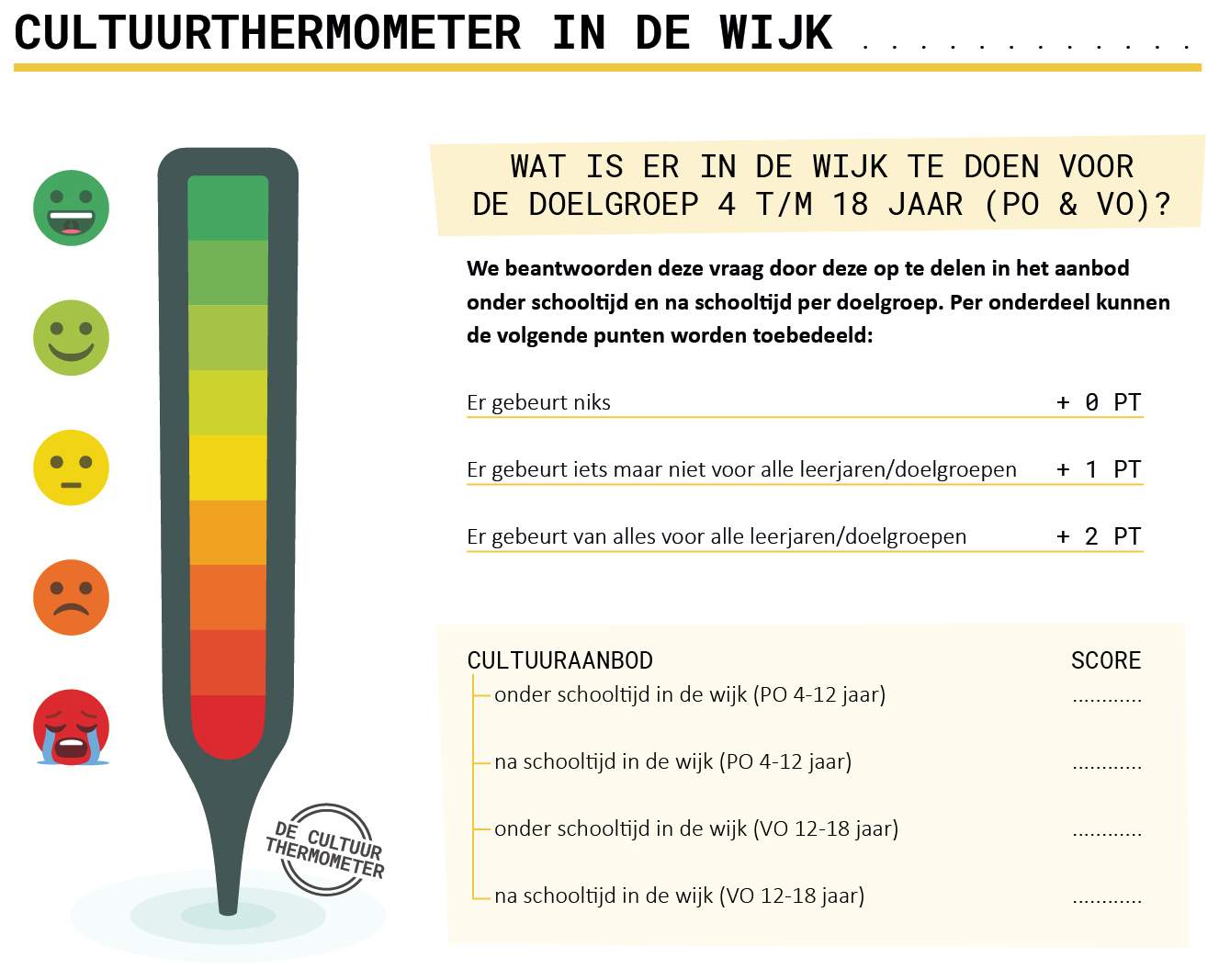 Tijdens elke bijeenkomst staat de vraag centraal: in hoeverre is er passend cultuuraanbod voor handen in de wijk onder én na schooltijd voor de verschillende doelgroepen van het PO en VO. We voeren per doelgroep een verdiepend gesprek over passend beschikbaar en eventueel missend aanbod. Deelnemers kennen punten toe als er passend aanbod aanwezig is waarbij de thermometer oploopt zodra er meer punten worden gegeven. Zo ontstaat er een gezamenlijk beeld van wat er onder schooltijd en na schooltijd in de wijk gebeurt of wat er nog mist.