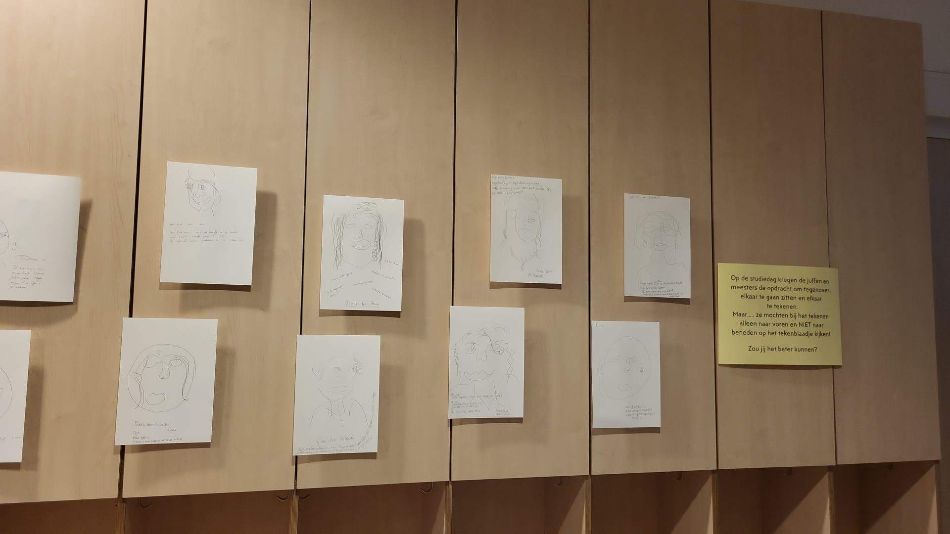 Ankje en Hedwig sloten hun onderdeel van de studiedag af met een opdracht om zelf te ervaren wat cultuuronderwijs met je kan doen. Het team tekende elkaar in tweetallen na zonder op het blad te kijken. Vervolgens schreef ieder bij het eigen portret wat hij of zij zag. Dit leverde de nodige hilariteit op. Iedereen beleefde veel plezier tijdens het tekenen, en voelde ook enige trots bij het presenteren van de portretten. Ze hangen nu tentoongesteld in de school; een mooi aandenken aan een waardevolle studieochtend!
